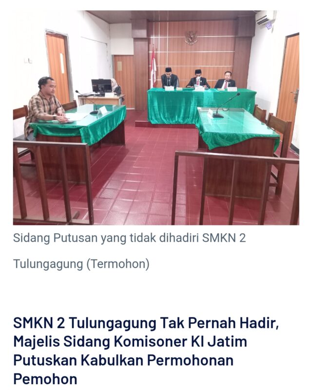 Untuk diketahui, LSM Badak mendaftarkan sengketa informasi ke Komisi Informasi Publik (KIP), dimana mereka meminta data BOS dan BPOPP Tahun 2023 kepada SMKN 2 Tulungagung. Karena merasa tidak dikabulkan oleh lembaga sekolah tersebut, maka LSM BADAK mendaftarkan ke KIP. Putusan KIP menetapkan bahwa sekolah harus memberikan data tersebut, karena merupakan informasi yang tidak dikecualikan. Tidak terima atas putusan KIP, pihak SMKN 2 Tulungagung mengajukan gugatan ke PTUN, hasilnya, putusan KIP dibatalkan. Karena putusan KIP dibatalkan, LSM BADAK mengajukan Kasasi ke Mahkamah Agung. Putusan akhir Mahkamah Agung adalah mengabulkan permintaan LSM BADAK dalam meminta informasi, dan SMKN 2 Tulungagung harus memberikan data yang dimaksud.(red)