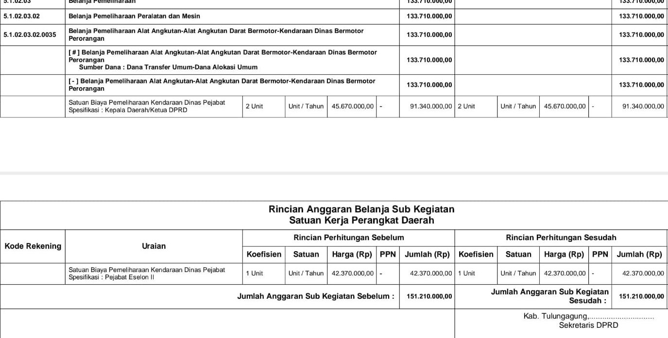 Tulungagung-tajampena.id. Dengung efisiensi anggaran tampaknya hanya simbolis saja. Jika sebelumnya Dinas Pendidikan Tulungagung sia-siakan anggaran untuk pembelian tanah, kini sorotan tajam mulai mengincar anggota DPRD Tulungagung. Baru-baru ini, tim tajampena.id, menemukan bahwa anggaran perawatan mobil Ketua DPRD Tulungagung Marsono, cukup besar. Dalam dokumen DPA, biaya perawatan dalam satu tahun total sebesar 91 juta 340 ribu rupiah. Dalam DPA 2024 ini disebut, biaya digunakan untuk perawatan kendaraan Kepala Daerah/Ketua DPRD sebanyak 2 unit.