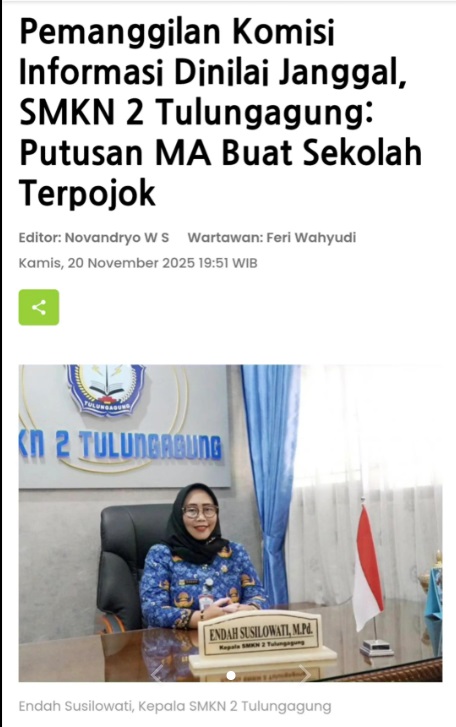 Untuk diketahui, kepala SMKN 2 Tulungagung Endah Susilowati melontarkan tanggapan atas putusan MA di medsos yang dimuat oleh akun Tik Tok Cangkir @onlayn_novosti. Dalam unggahan tersebut, Endah menilai, sekolah bukanlah Pejabat Pengelola Informasi dan Dokumentasi sehingga tidak berwenang memberikan informasi publik. Reaksi ini muncul setelah kalah dengan putusan MA atas sengketa informasi dengan LSM BADAK.(red)